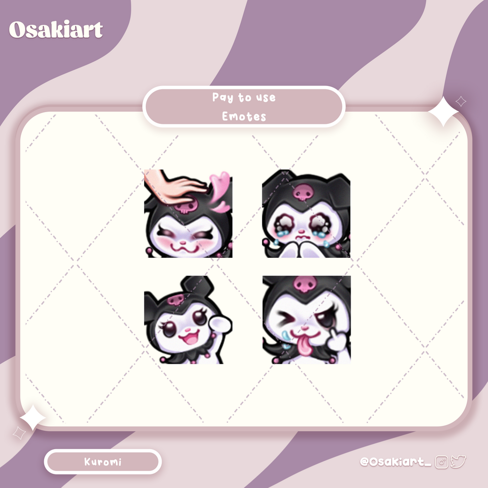 4x Kuromi emotes that comes in PNG format and in the sizes that twitch requires (112x112px 56x56px 28x28px).